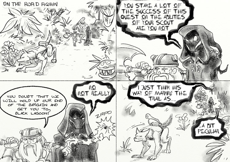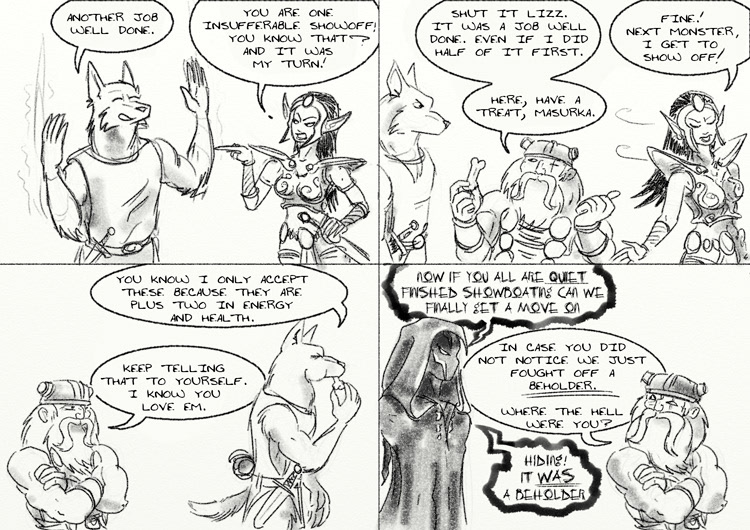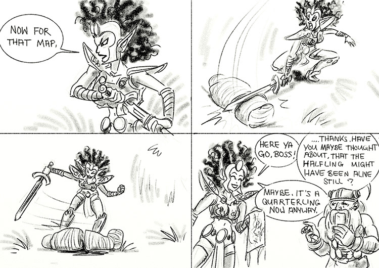 A page a day exercise from a couple of years ago, visualizing some old DnD adventures and characters to help Rich out with a filler for his Web comic "YetAnotherFantasyGamerComic" during his baby pauseĀ